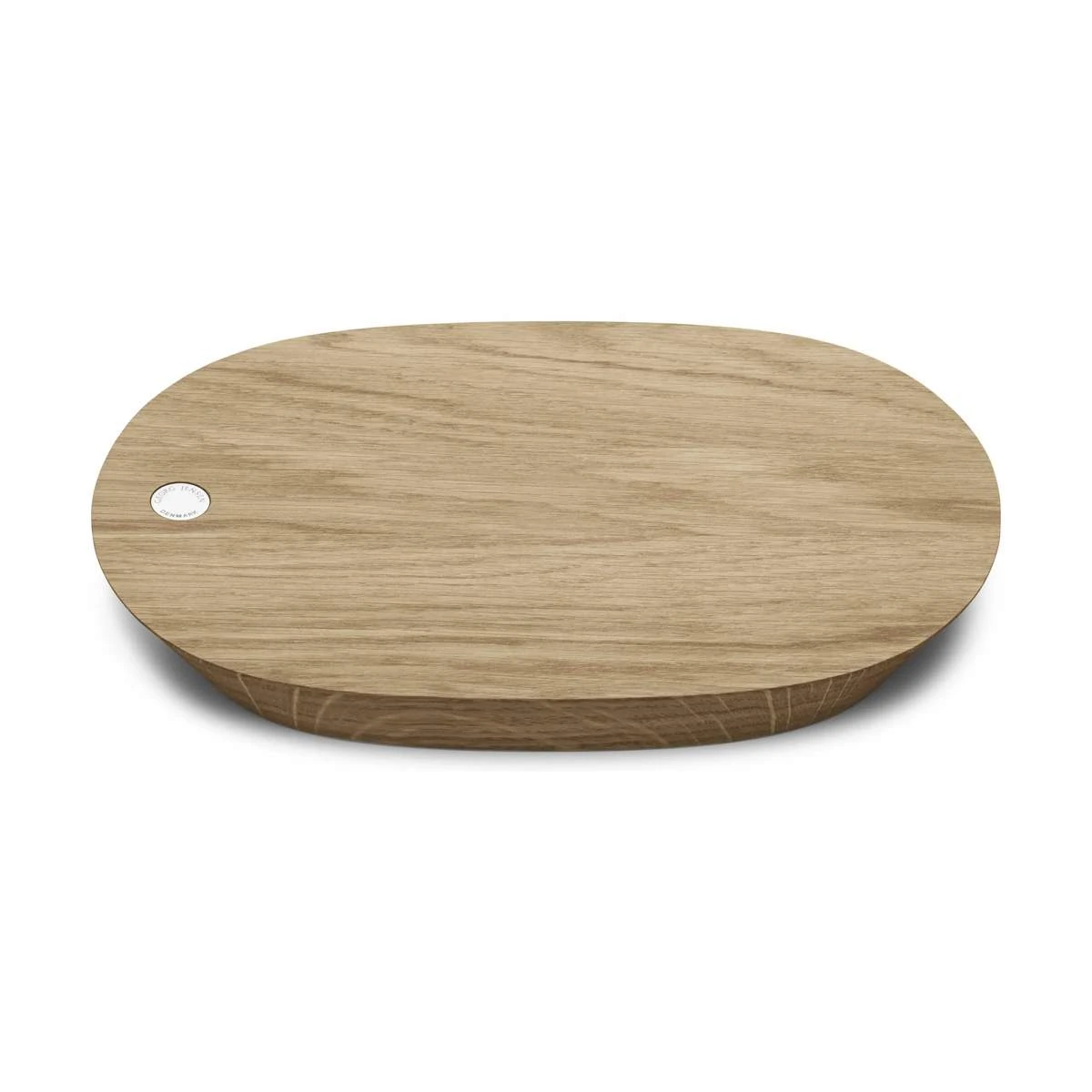 Det flotte Alfredo skærebræt fra Georg Jensen er fremstillet i massivt egetræ. Det er et design fra Alfredo serien, der er skabt til at løfte stilen i ethvert køkken. Skærebrættets ovale form og skrå kanter giver et elegant og unikt udtryk – et design, som også er praktisk og nemt at holde på. Som en flot detalje bærer træbrættet en lille plade i rustfrit stål med Georg Jensens logo. Selvom det er et skærebræt, kan du med fordel bruge det til servering.